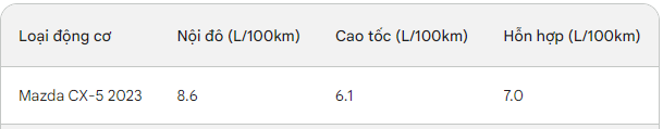 Theo đó, Mazda CX-5 2023 có mức tiêu thụ nhiên liệu như sau: