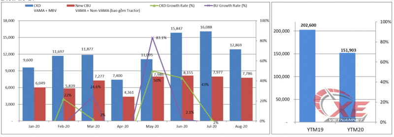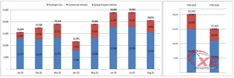 Tính chung 8 tháng đã qua, theo VAMA, thị trường ô tô Việt Nam bán được 151.903 xe, giảm 25% so với cùng kỳ năm ngoái. Số liệu này chưa tính thêm báo cáo từ TC Motor (nhà phân phối xe Hyundai), Vinfast và Mercedes-Benz Việt Nam.
