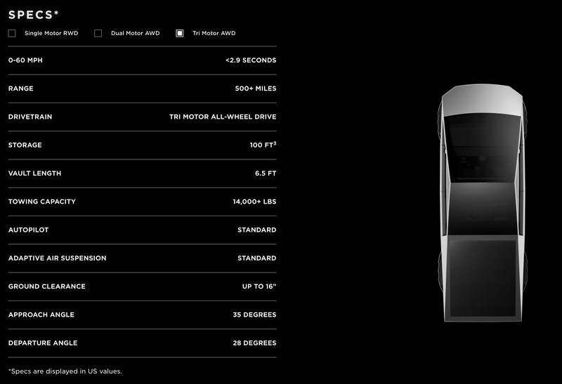 Có 3 phiên bản cho Cybertruck với quãng đường đi được tương đương 400 km, 480 km và 800 km cho một lần sạc.
