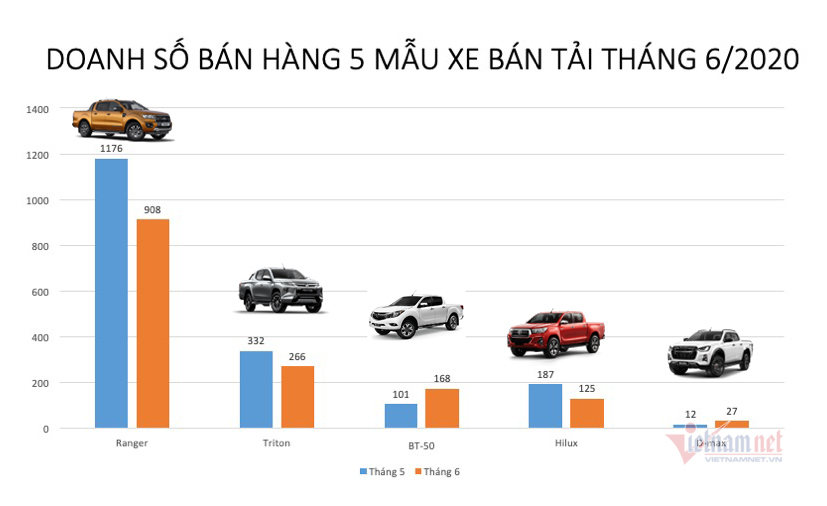 Dưới đây là doanh số của 5 mẫu xe bán tải trong tháng 6 vừa qua: