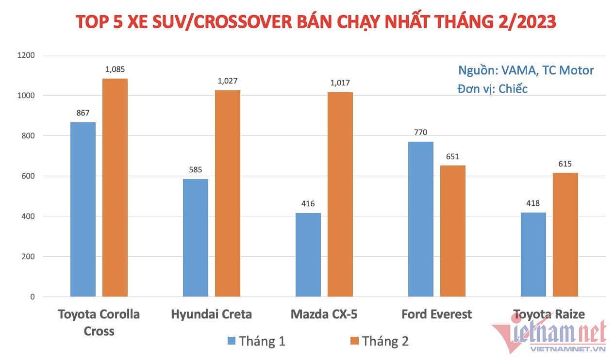 Kết thúc tháng 2/2023, Toyota Corolla Cross đạt doanh số 1.085 chiếc, tăng 25,1% so với tháng trước. Doanh số trên vẫn đủ giúp mẫu xe ăn khách nhất của Toyota giữ vững ngôi số 1 trong top xe đa dụng bán chạy.