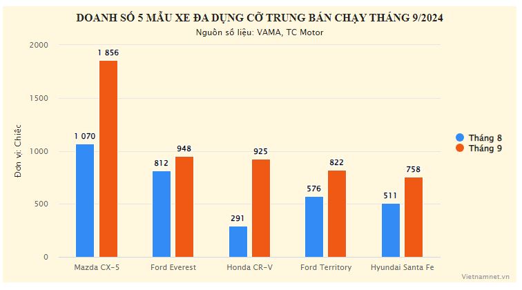 Ở nhóm xe đa dụng cỡ trung (C-D) có giá trên dưới 1 tỷ đồng, Mazda CX-5 vẫn là cái tên nổi bật nhất khi đạt doanh số tới 1.856 chiếc, gần gấp đôi so với mẫu xe xếp thứ hai là Ford Everest.