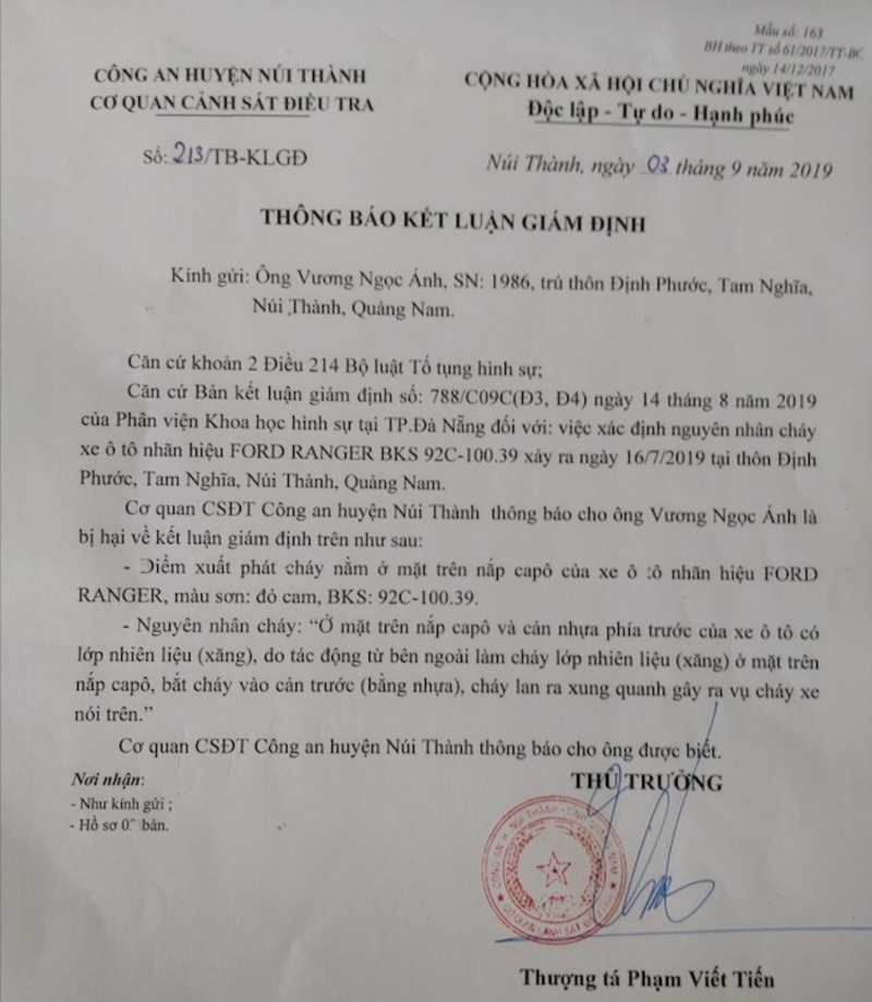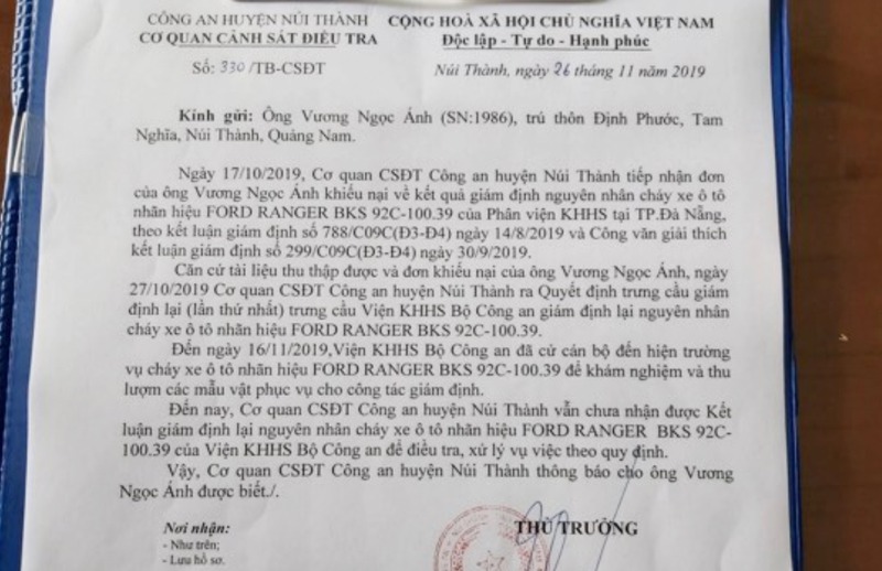Ngày 26/11/2019, Cơ quan cảnh sát điều tra Công an huyện Núi Thành đã có văn bản số 330/TB-CSĐT phúc đáp về văn bản khiếu nại của anh A. về kết quả giám định nguyên nhân cháy xe của Phân viện KHHS tại TP. Đà Nẵng, theo kết luận giám định số 788/C09C(Đ3-Đ4) ngày 14/8/2019 và Công văn giải thích kết luận giám định số 299/C09C(Đ3-Đ4) ngày 30/9/2019. Văn bản do Thượng tá Phạm Viết Tiến - Thủ trưởng Cơ quan cảnh sát điều tra Công an huyện Núi Thành nêu rõ: