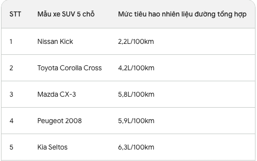 Nissan Kicks e-Power 2023 hiện đang được ghi nhận là mẫu xe gầm cao tiết kiệm xăng nhất. Theo dữ liệu của Cục Đăng kiểm Việt Nam, Nissan Kicks tiêu thụ 2,2L/100km trong đô thị, 6,1L/100km ngoài đô thị, và 4,6L/100km đường hỗn hợp.