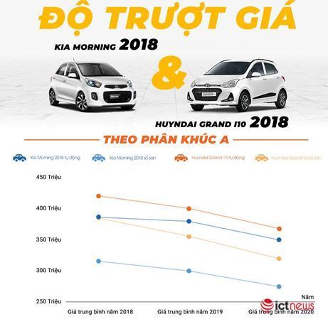Trong phân khúc xe cỡ nhỏ đô thị hạng A, Kia Morning được tìm mua nhiều hơn ở thị trường xe cũ. Dòng xe này cũng giữ giá tốt hơn ở cả 2 phiên bản số sàn và số tự động. Trung bình một chiếc Kia Morning đời 2018 phiên bản tự động, chạy dưới 30.000 km có giá khoảng 350 triệu, chỉ mất đi 10% giá trị so với thời điểm lăn bánh. Trong khi đó, Hyundai Grand i10 số tự động có giá lăn bánh 420 triệu ở thời điểm 2018 hiện có giá trung bình 360 triệu, mức trượt giá khoảng 16% so với thời điểm ra mắt.