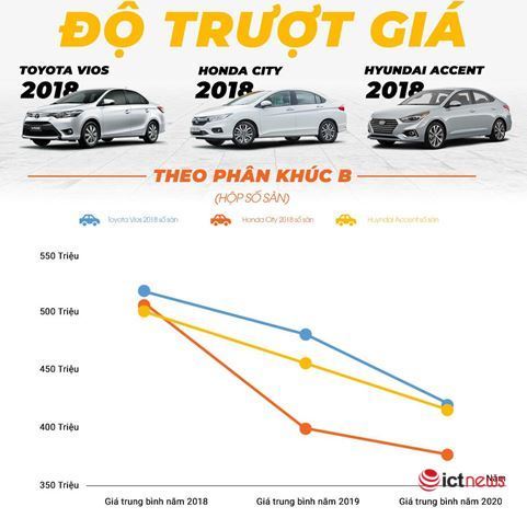 Thống kê cho thấy, Hyundai Accent sau 2 năm lăn bánh trượt giá khoảng 45 triệu với phiên bản số sàn và 85 triệu so với phiên bản số tự động. Còn Toyota Vios năm 2018 mất giá từ 80 triệu đến 100 triệu, tương đương 14 - 20% giá trị ban đầu sau 2 năm lăn bánh.