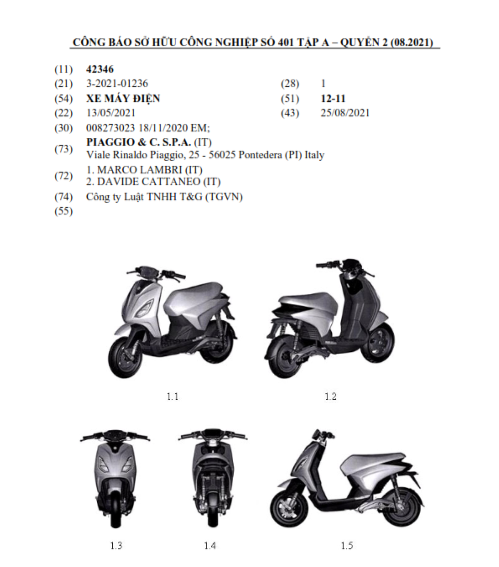 Công báo sở hữu công nghiệp tháng 8/2021 của Cục sở hữu trí tuệ Việt Nam vừa qua đã có những thông tin đăng ký bản quyền mẫu xe máy điện Piaggio One. Chủ sở hữu sản phẩm là Công ty Piaggio Việt Nam.