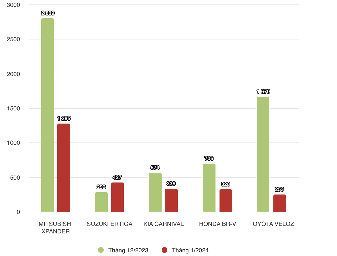 Bên cạnh đó, bảng xếp hạng top 5 mẫu MPV doanh số cao nhất có sự xáo trộn mạnh, ngoài vị trí số 1 của Mitsubishi Xpander không thay đổi thì các thứ tự còn lại đã được hoán đổi. Suzuki Ertiga sau nhiều tháng đứng vòng ngoài đã leo lên vị trí số 2 của tháng đầu năm 2024, đẩy Toyota Veloz rớt xuống vị trí số 5. Ở vị trí số 3 là KIA Carnival "thế chân" cho mẫu Hyundai Custin đã rớt khỏi top 5. Vị trí số 4 giữ nguyên đối với Honda BR-V.