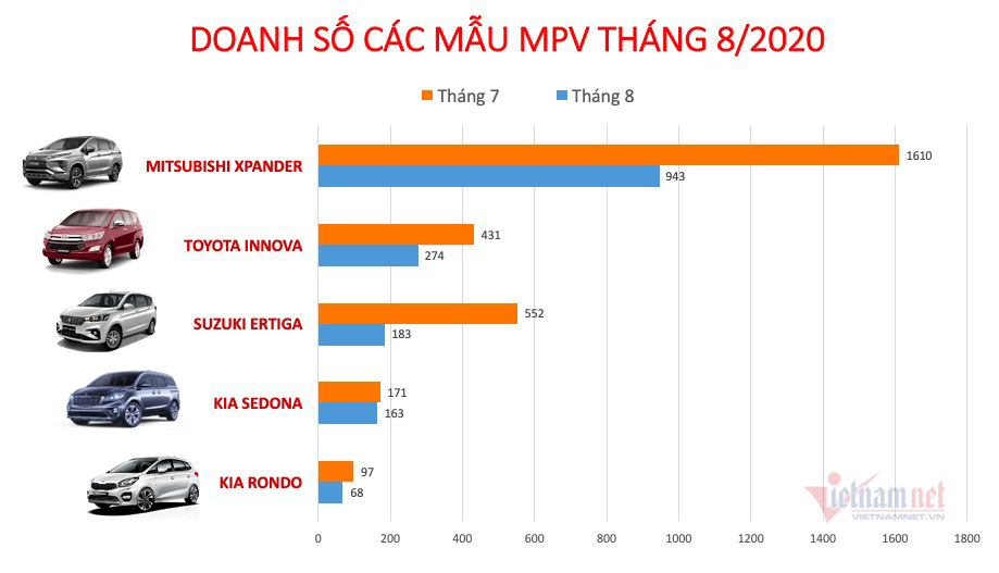 Mitsubishi Xpander đạt doanh số 943 xe bán ra trong tháng 8, giảm 667 chiếc so với tháng 7 (giảm 41%). Tuy nhiên, với doanh số này, Xpander vẫn thống trị dòng xe MPV khi chiếm đến hơn 56% số lượng xe bán ra của toàn phân khúc. Trong 8 tháng đầu năm, Xpander đạt tổng doanh số là 8.436 chiếc.
