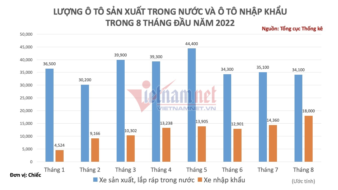 Cũng theo báo cáo của Tổng cục Thống kê, chỉ trong tháng 8, ước tính có tới 18.000 chiếc ô tô nguyên chiếc được nhập về Việt Nam với tổng giá trị kim ngạch ước đạt 375 triệu USD. Như vậy, xe nhập khẩu đã tăng mạnh 25,3% về số lượng và tăng 25,2% về giá trị với tháng 7 (14.360 chiếc với giá trị 299,5 triệu USD)