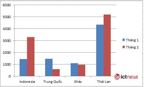 Trong đó, Thái Lan chiếm tỷ trọng lớn nhất với 5.196 xe. Tháng 2 cũng chứng kiến sự tăng trưởng trở lại của các mẫu xe nhập khẩu từ thị trường Indonesia. Theo đó, xe nhập khẩu nguyên chiếc từ Indonesia đạt 3.300 chiếc. Kim ngạch nhập khẩu xe từ Trung Quốc vẫn giảm, còn 589 chiếc.