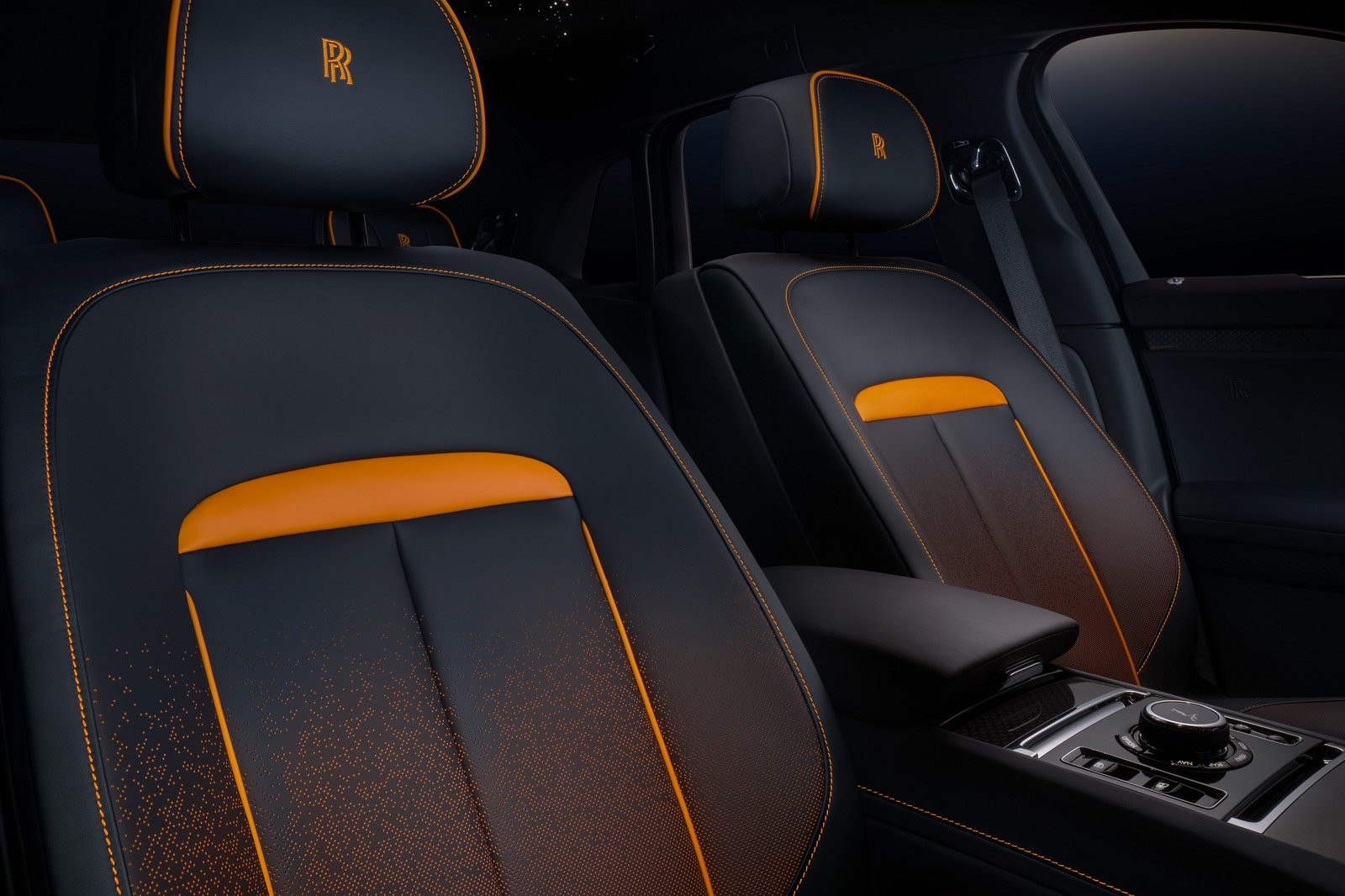 Ngoài ra, nội thất của chiếc xe được thiết kế với chủ đề hoàng hôn với 2 tông màu chủ đạo cam và đen. Bộ ghế da màu cam Mandarin được nhuộm đen, sau đó được hoàn thiện bởi hơn 200.000 khe thông gió, giúp làm lộ ra màu sắc nguyên bản của bộ da này. Một số chi tiết độc đáo của chiếc xe này bao gồm bệ bước hàng thửa có phát sáng, bộ dù nguyên bản với thân màu cam Mandarin, bạt trùm xe với logo Private Collection…