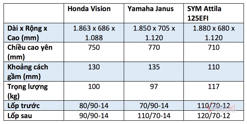 Trong khi đó mẫu Honda Vision sở hữu chiều dài hơn Yamaha Janus 13mm và ngắn hơn SYM Attila 23mm giúp phần đuôi xe tạo hình vuốt ngược giống đàn anh SH Mode hay SH, nhưng đem lại cảm giác nhỏ bé bởi chiều ngang và chiều cao khiêm tốn hơn so với hai đối thủ còn lại.