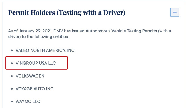 Theo thông tin từ Cơ quan quản lý các phương tiện cơ giới bang California, Mỹ (California DMV), Vingroup USA LLC đã xuất hiện trong danh sách những công ty được thử nghiệm xe tự lái tại đây. Điều này đồng nghĩa với việc trong thời gian tới, những chiếc xe tự lái VinFast sẽ xuất hiện trên đường phố Mỹ. Đại diện VinFast cũng đã xác nhận thông tin này.