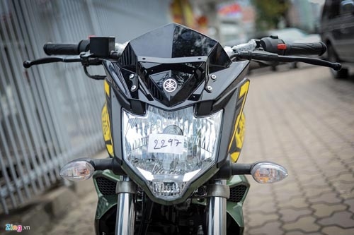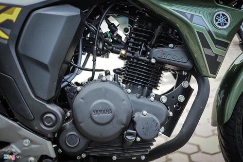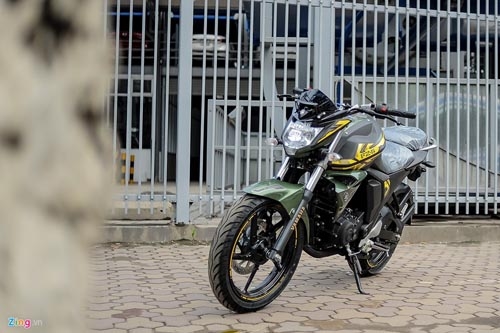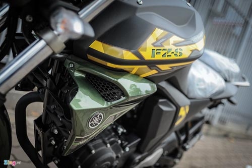 | FZ-S V2.0 2016 mới về Hà Nội khoác trên mình màu sơn xanh quân đội Matt Green, cùng với đó là những họa tiết trang trí màu vàng ở nhiều vị trí trên thân xe. |