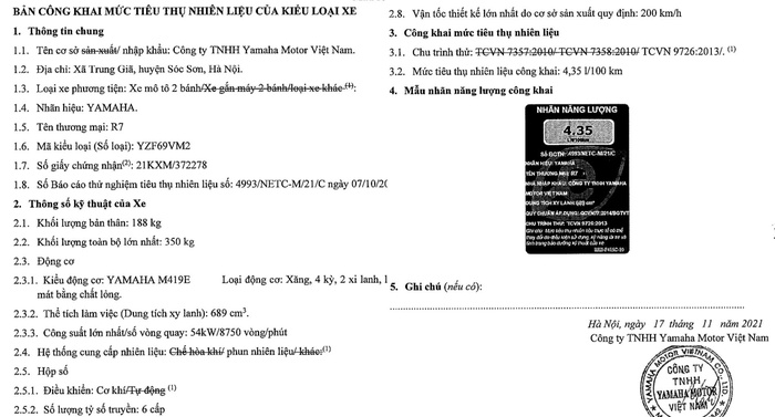 Theo thông tin trên cổng Cục Đăng kiểm Việt Nam, đơn vị nhập khẩu mẫu xe máy hoàn toàn mới Yamaha YZF-R7 là Công ty TNHH Yamaha Motor Việt Nam. Mẫu xe này có mã số YZF69VM2, tên thương mại R7, được cấp số báo cáo thử nghiệm nhiên liệu ngày 7/10/2021.
