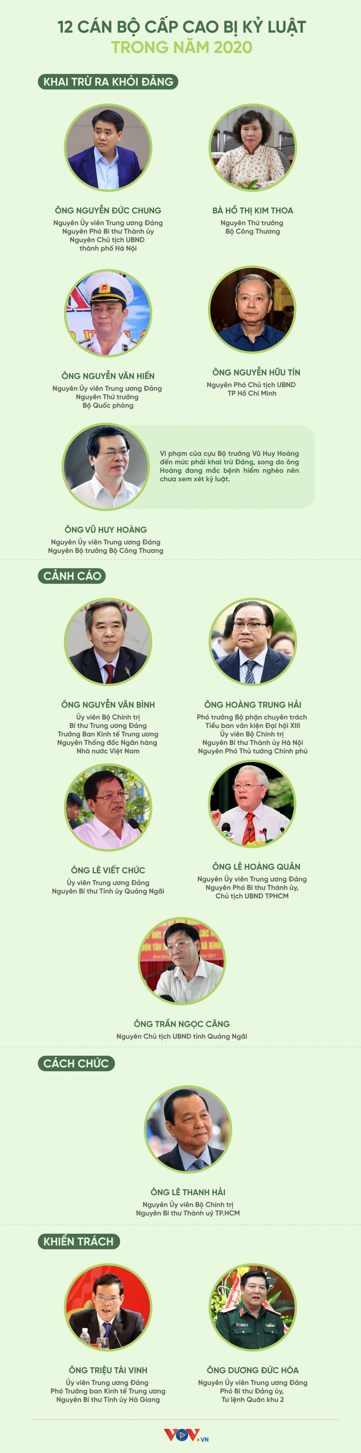 Năm 2020, có 12 cán bộ cấp cao bị xử lý kỷ luật bằng nhiều hình thức khác nhau: Khai trừ, cảnh cáo, cách chức, khiển trách.
