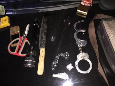 Qua kiểm tra tại chỗ phát hiện, phía sau ghế lái có 1 khoá số 8 được cất giấu, ở trong cốp xe cạnh ghế lái có 1 coong dùng để sử dụng ma tuý đá, 1 dao dài sắc nhọn khoảng 30 cm.