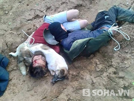Hình ảnh hai nam thanh niên bị trói quặt tay chân bên cạnh xác một con chó được xác nhận là các "cẩu tặc" tại xã Giáp Lai.