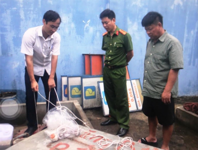 Chủ doanh nghiệp Thanh Ngũ (bên phải) và lực lượng CSKT kiểm tra bồn chứa xăng, lấy mẫu để giám định phục vụ công tác điều tra. |
