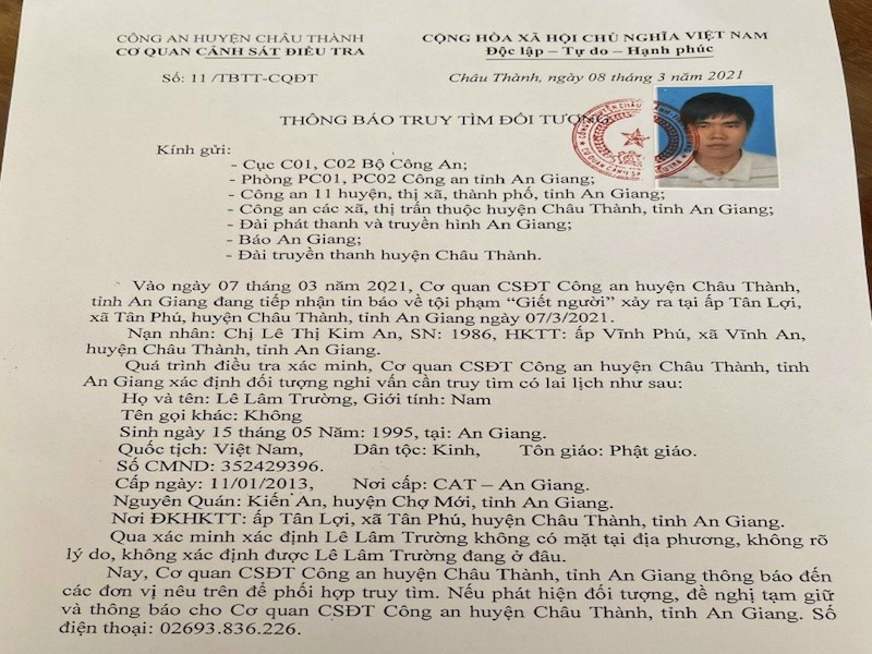 Ngày 8/3, Cơ quan Cảnh sát điều tra Công an huyện Châu Thành, tỉnh An Giang đã ra thông báo truy tìm Lê Lâm Trường (26 tuổi, ngụ ấp Tân Lợi, xã Tân Phú, huyện Châu Thanh) do bị tình nghi đến vụ án giết người xảy trên địa bàn.