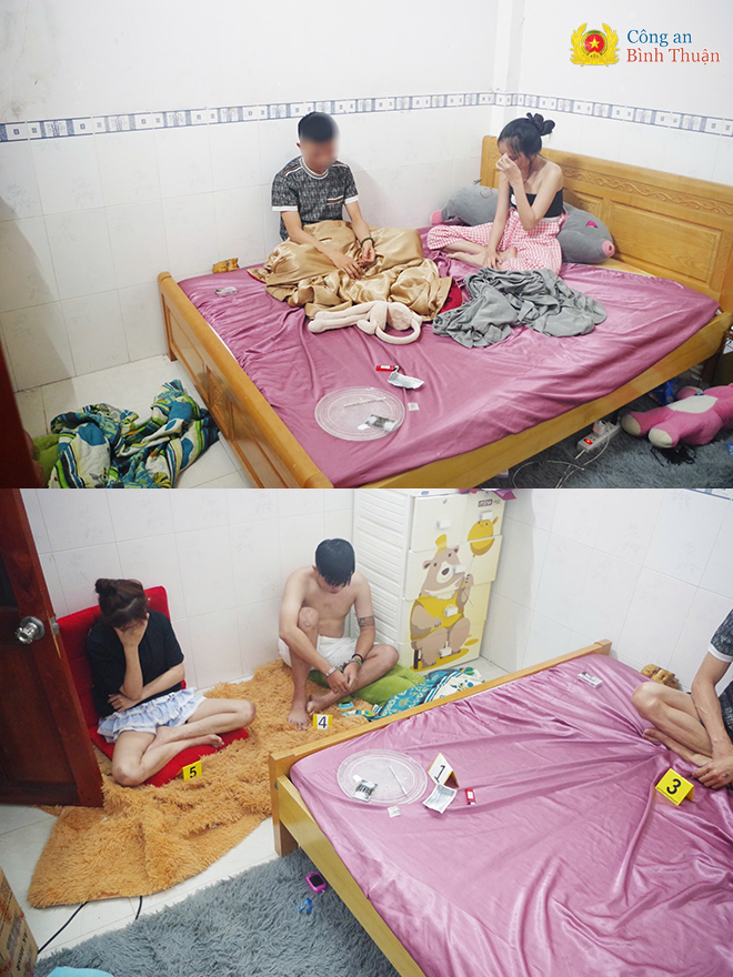 Tại phòng thứ hai của ngôi nhà, có 4 đối tượng đang ở trong phòng gồm: M.C.T.Đ (sinh năm 2002), T.T.T.L (sinh năm 2007), N.C.T (sinh năm 2007), cùng trú tại thị Đức Tài, huyện Đức Linh và N.T.T.H (sinh năm 2003; trú tại xã Đức Tín, huyện Đức Linh) đang có hành vi tổ chức sử dụng trái phép chất ma túy.