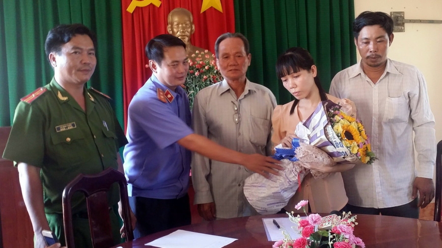 Viện KSND huyện Nhơn Trạch tặng hoa, xin lỗi bà Ngọc - Ảnh: Hà Mi |