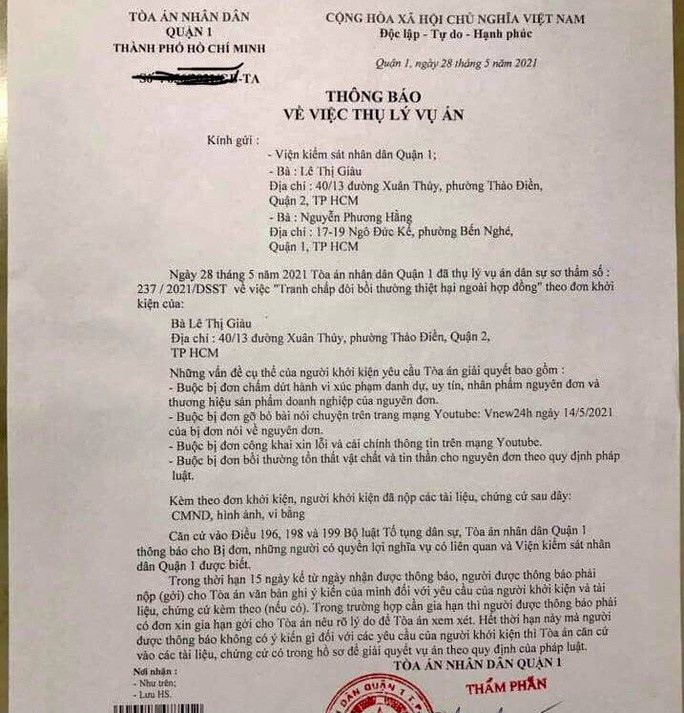 Từ đó, bà Lê Thị Giàu đã khởi kiện, yêu cầu TAND quận 1 buộc bà Nguyễn Phương Hằng chấm dứt ngay hành vi xúc phạm danh dự, uy tín của bà, buộc bà Hằng gỡ bài nói về bà, công khai xin lỗi và cải chính trên mạng YouTube.