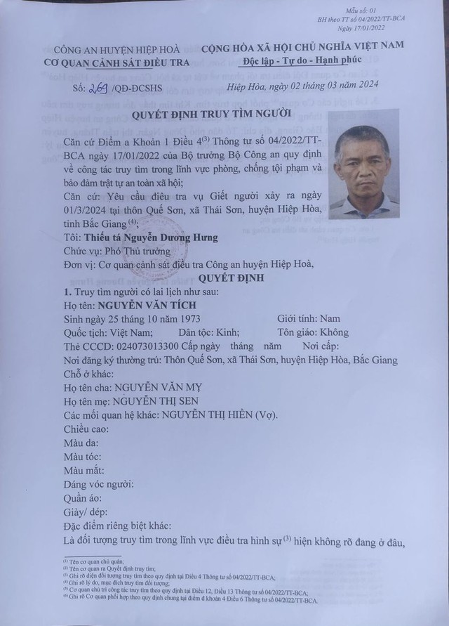 Chiều 3/2, cơ quan Cảnh sát điều tra, Công an huyện Hiệp Hòa (Bắc Giang) đã ra quyết định truy tìm đối tượng Nguyễn Văn Tích, sinh năm 1973, trú tại thôn Quế Sơn, xã Thái Sơn, huyện Hiệp Hòa (Bắc Giang) để điều tra làm rõ hành vi giết người.