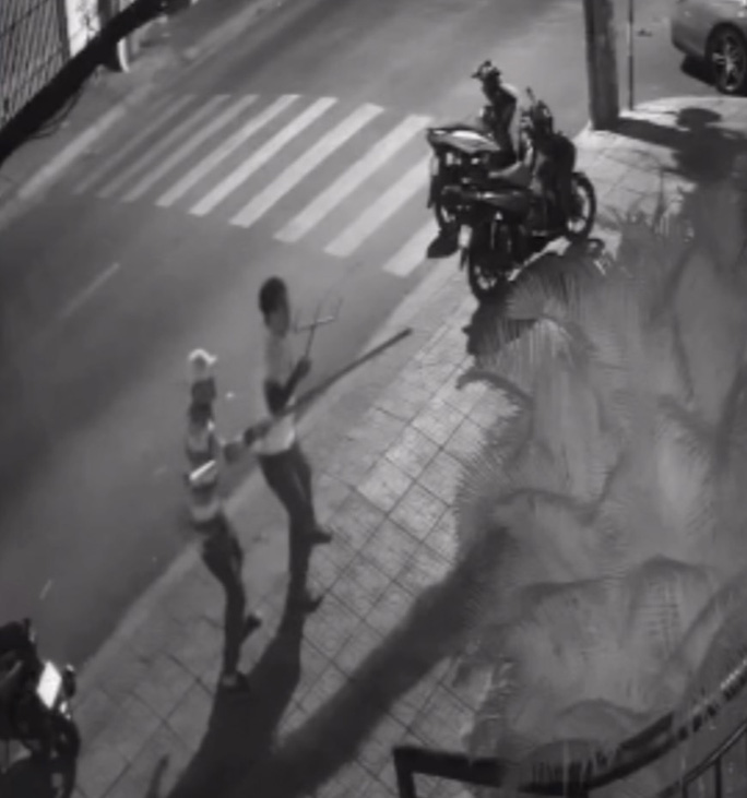 Cùng thời điểm này 5 đối tượng khác (bao gồm 1 cô gái) cầm theo mã tấu, dao tự chế... xông vào trong quán. Cả bọn cầm hung khí đứng cảnh giới thành 2 lớp để 1 thành viên dùng cây chĩa đâm liên tục vào người anh N.