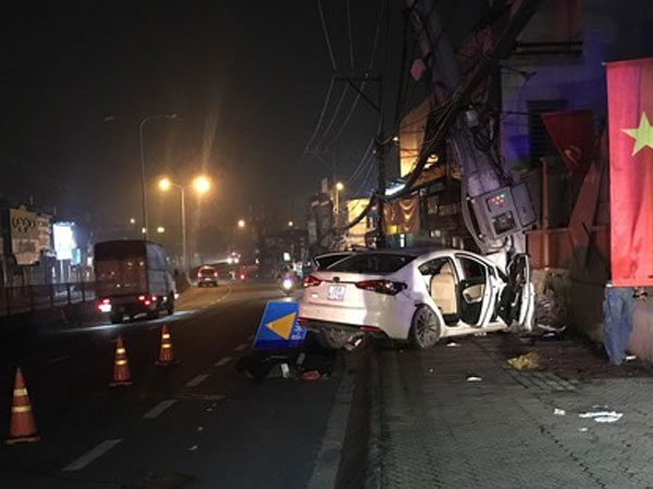 Đến trước UBND phường Linh Xuân, ô tô đã lao lên vỉa hè tông vào cột điện. Vụ việc làm 2 thanh niên bị thương nặng, cột điện hư hỏng.