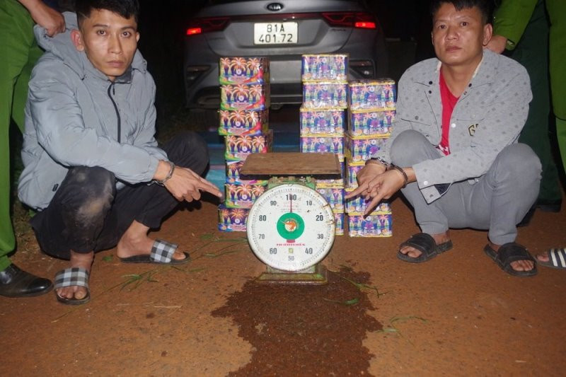 Trước đó 1 ngày, tại khu vực đường mòn thuộc địa phận làng Chan, xã Ia Pnôn, Công an huyện Đức Cơ phối hợp Công an xã Ia Pnôn và các lực lượng Bộ đội Biên phòng trên địa bàn, bắt quả tang Phạm Công Minh (SN 2000, trú tại Tổ 9, thị trấn Chư Ty) và Quách Tiến Hoàng (SN 1996, trú tại thôn Đoàn Kết, xã Ia Dơk, cùng huyện Đức Cơ) đang điều khiển xe máy chở 20 hộp pháo hoa nổ với tổng khối lượng khoảng 33kg.