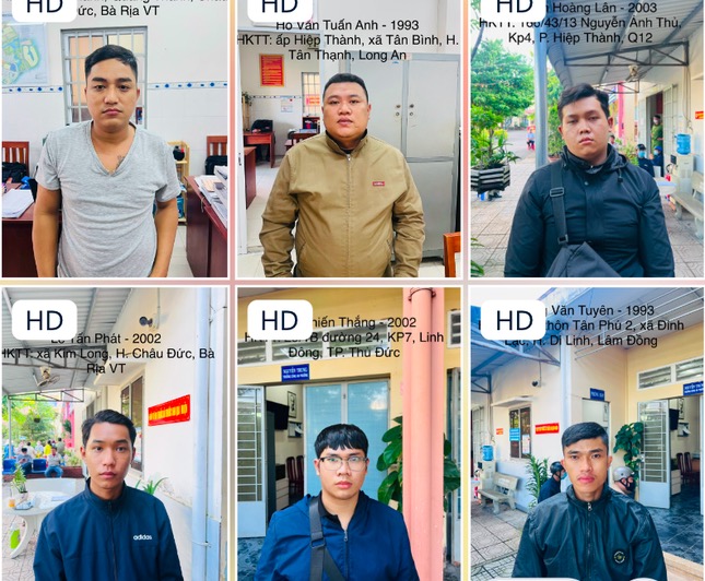 Cụ thể, đã có 6 đối tượng bị bắt, gồm: Lê Tấn Phát (20 tuổi), Nguyễn Ngọc Minh (32 tuổi, cùng quê Bà Rịa – Vũng Tàu), Hồ Văn Tuấn Anh (29 tuổi, quê Long An), Nguyễn Hoàng Lân (19 tuổi, ngụ quận 12), Lâm Chiến Thắng (20 tuổi, ngụ thành phố Thủ Đức) và Lương Văn Tuyên (32 tuổi, quê Lâm Đồng).