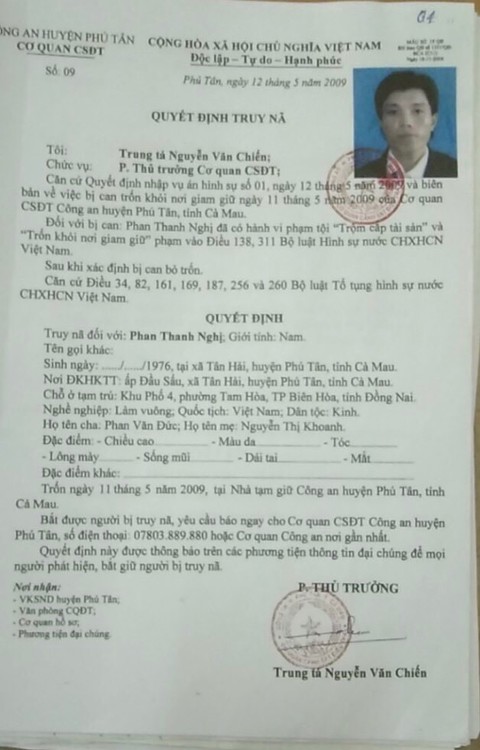 Tối 16/2, Phòng cảnh sát hình sự Công an tỉnh Bình Dương đã bắt giữ được Phan Thanh Nghị (SN 1976, quê Cà Mau, HKTT: Biên Hoà, Đồng Nai). Nghị là đối tượng đã bỏ trốn khi đang trong thời gian bị tạm giam tại Công an TX.Tân Uyên, tỉnh Bình Dương.