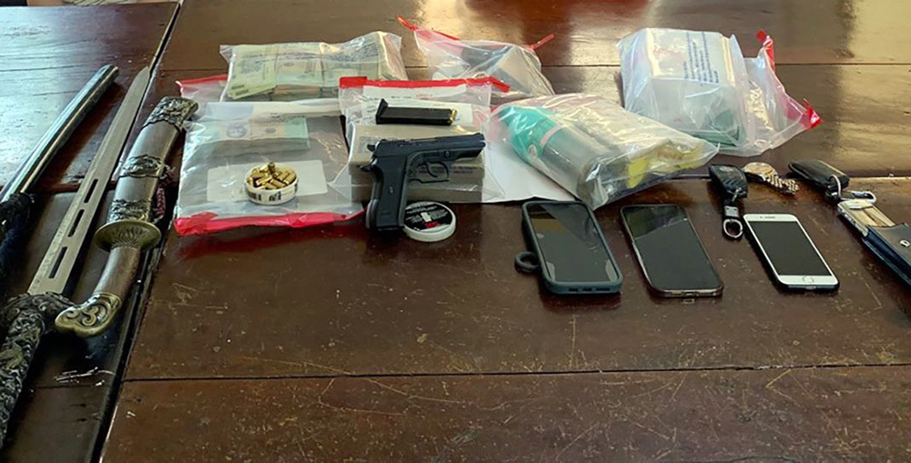 Quá trình khám xét cũng thu giữ 7 cục dạng sừng (nghi là sừng tê giác) có khối lượng 711,915gam, 2 xe ô tô (1 xe MERCEDES, 1 xe LEXUS 350), 1 khẩu súng cùng 25 viên đạn...