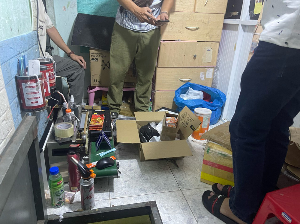 Ngoài ra, công an phát hiện, thu giữ 4,8kg bột hóa chất phụ gia phục vụ quá trình bào chế, đóng gói ma túy nước vui thành phẩm; hơn 1.000 vỏ túi nước vui và 1 dập viên nén, 2 máy ép nhiệt để phục vụ hoạt động bào chế ma túy loại nước vui.