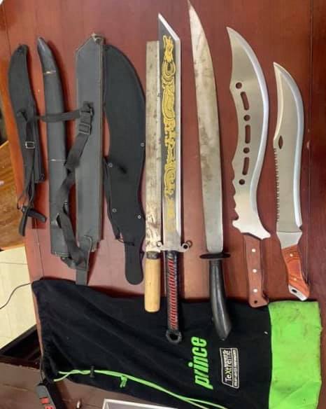 Kiểm tra chiếc túi, cảnh sát thu giữ 3 dao nhọn và 2 kiếm bằng kim loại.