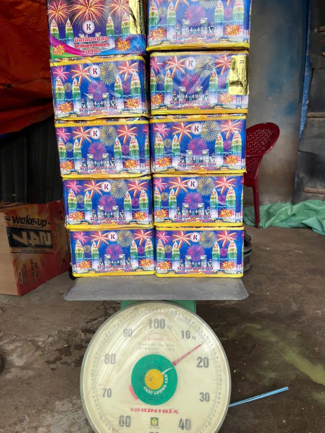 Tiến hành khám xét nhà của 2 đối tượng, công an thu giữ thêm 8 hộp pháo có trọng lượng 12,3kg.