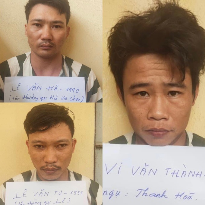 Theo đó, các đối tượng bị bắt giữ gồm: Lê Văn Hà, (Hà “ve chai”, SN 1990) Lê Văn Tư (tự Lé, SN 1995), Vi Văn Thành (SN 1993, cùng quê Thanh Hóa) và Nguyễn Phước Giào (SN 1989, quê An Giang).