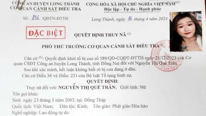 Theo đó, vào lúc 11h30 ngày 15/4, tại luồng nhập cảnh Trạm cửa khẩu quốc tế Mộc Bài (huyện Bến Cầu, tỉnh Tây Ninh), tổ công tác Trạm cửa khẩu quốc tế phát hiện Nguyễn Thị Quế Trân (SN 2003, trú xã An Long, huyện Tam Nông, tỉnh Đồng Tháp), làm thủ tục nhập cảnh từ Campuchia về Việt Nam là đối tượng truy nã đặc biệt theo quyết định số 856, ngày 4/4/2024 của Cơ quan Cảnh sát điều tra, Công an huyện Long Thành, tỉnh Đồng Nai về tội “ Cướp tài sản”.