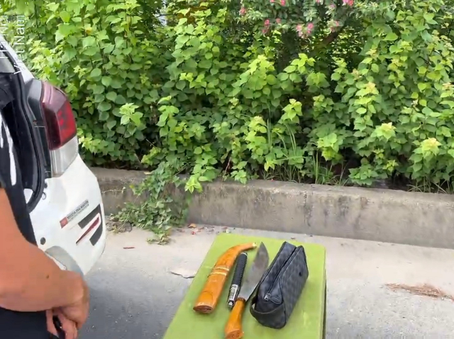 Tiếp tục kiểm tra phương tiện, Tổ công tác phát hiện tại cốp sau xe ô tô BKS 20A-341.xx có 01 dao nhọn dài khoảng 75 cm; tại ngăn để đồ bên cửa lái phát hiện 01 gậy 3 khúc bằng kim loại.