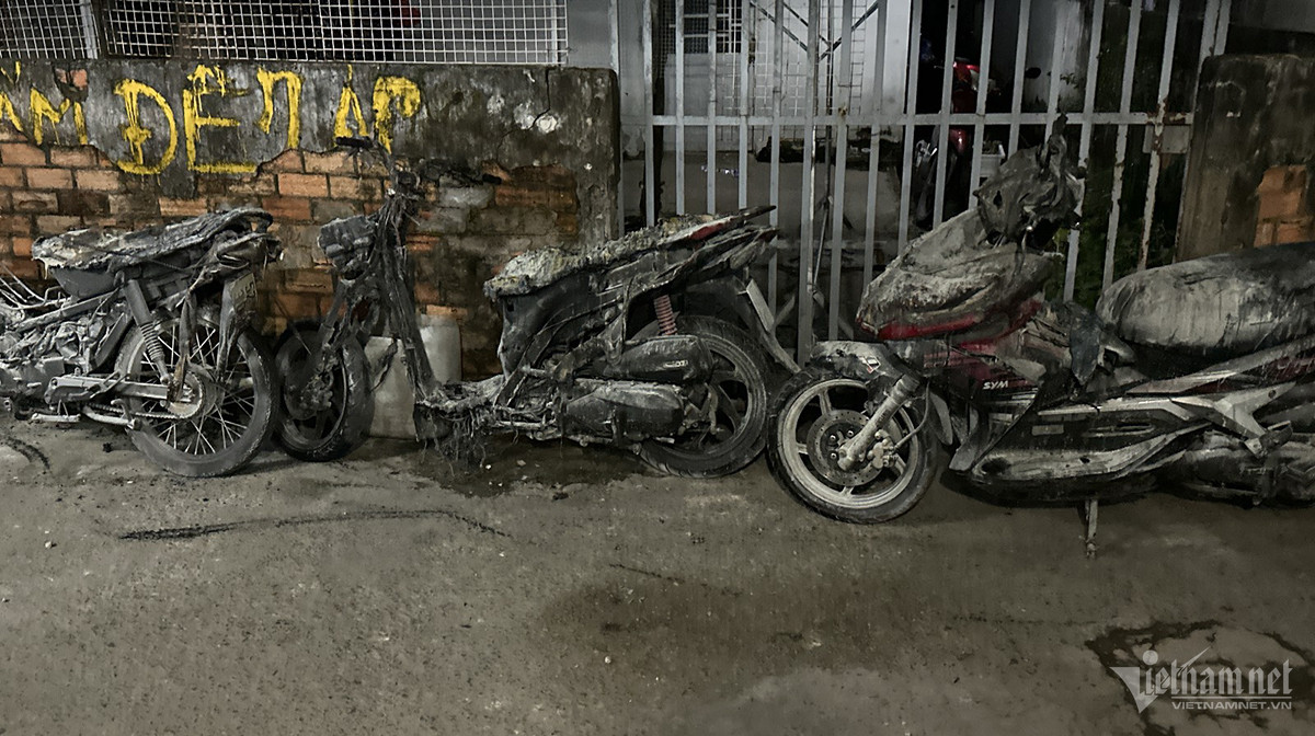Tại hiện trường vụ phóng hỏa, 3 xe máy là tài sản quý giá nhất của gia đình bị thiêu rụi, chỉ còn trơ khung sắt, nhiều vật dụng trong nhà cháy nham nhở. Vợ ông Nguyễn Văn Nhiều bị thương ở chân, may mắn sau điều trị cũng đã được xuất viện.