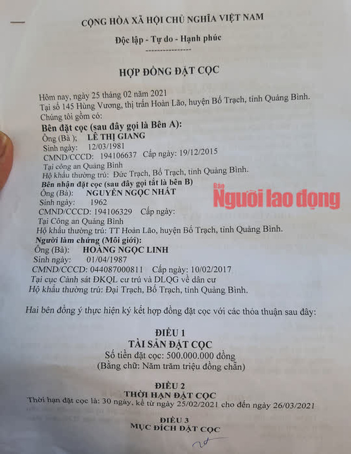 Cùng ngày, ông Nhất và bà Giang đã ký hợp đồng đặt cọc mua đất. Phía bà Giang đã chuyển 500 triệu đồng tiền cọc đúng với cam kết như trong hợp đồng. Hợp đồng có thời hạn trong vòng 31 ngày (từ 25-2 đến 26-3-2021).