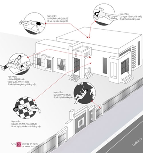 | Vị trí thi thể của các nạn nhân trong căn biệt thự (Chi tiết). Đồ họa: Tiến Thành - Việt Chung |
