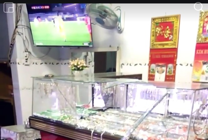 Tại hiện trường, tủ kính của tiệm vàng vỡ, một số nữ trang rơi xuống nền nhà.