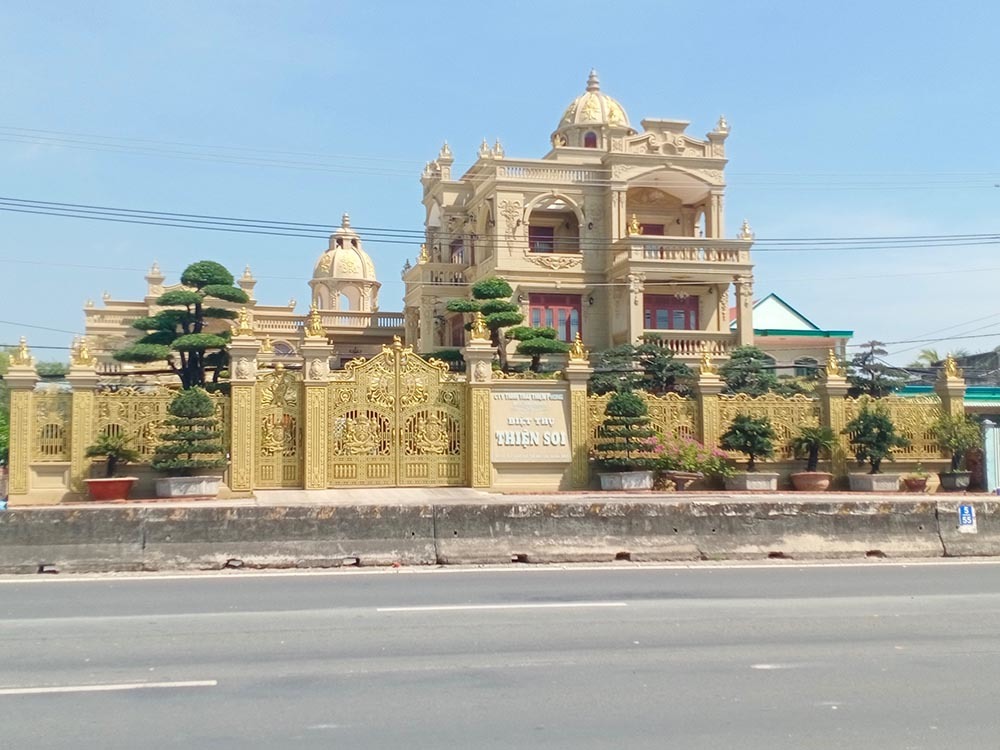 Bên trong có nhiều đồ gỗ, họa tiết trang trí "dát vàng"; nhiều loại xe hơi đắt tiền. Bên ngoài biệt thự có một bảng hiệu trên nền đá để tên Thiện Soi, ghép từ tên hai vợ chồng.