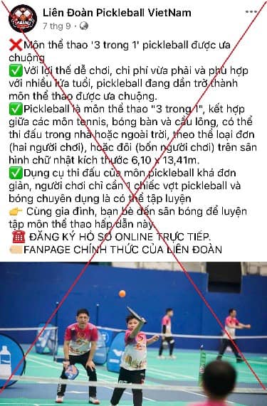 Theo Bộ Công an, hiện nay, môn thể thao Pickleball đang thu hút được sự quan tâm của nhiều người dân. Lợi dụng việc này, một số đối tượng đã lập các trang Facebook "Liên đoàn Pickleball Việt Nam" để tìm cách lừa đảo chiếm đoạt tài sản người đăng ký tham gia học chơi Pickleball.