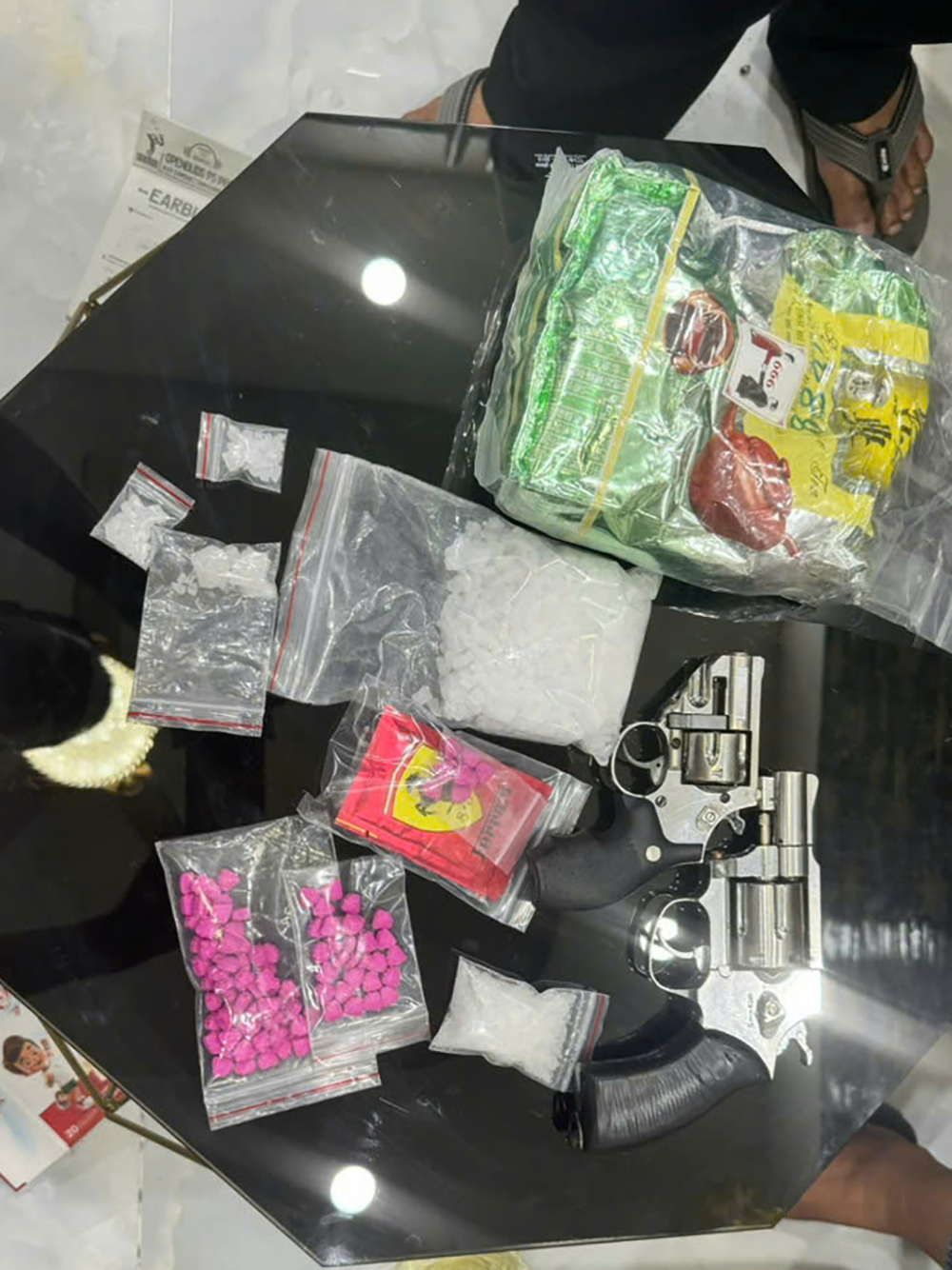 Từ lời khai này, Công an quận Bình Tân phối hợp cùng Công an huyện Bến Lức, tỉnh Long An để truy xét, bắt giữ đối tượng Em. Khám xét nơi ở, công an thu giữ lượng lớn ma túy được chia nhỏ thành các gói nylon cùng 1 khẩu súng và 2 viên đạn.