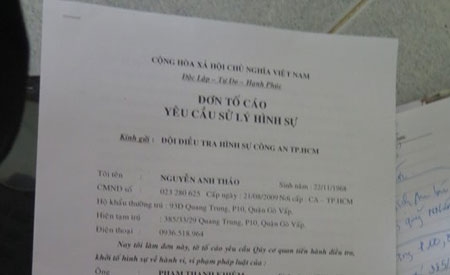 Đơn yêu cầu xử lý hình sự của gia đình bà Thảo liên quan đến việc gia đình bà bị tấn công suốt hơn hai năm qua. |