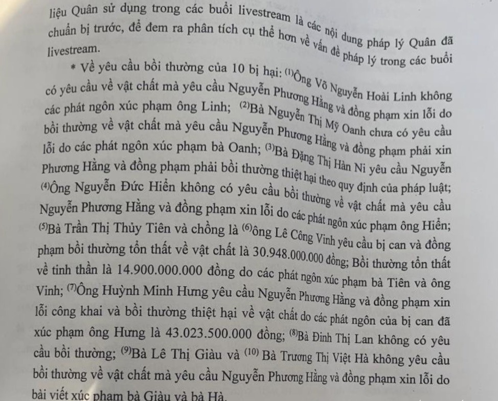 Cụ thể, về yêu cầu bồi thường của 10 bị hại, bà Trần Thị Thủy Tiên (ca sĩ Thủy Tiên) và chồng là ông Lê Công Vinh yêu cầu bà Phương Hằng và đồng phạm bồi thường 30,4 tỷ đồng tiền tổn thất vật chất; 14,9 tỷ đồng tiền tổn thất về tinh thần do các phát ngôn xúc phạm vợ chồng Thủy Tiên và Công Vinh.